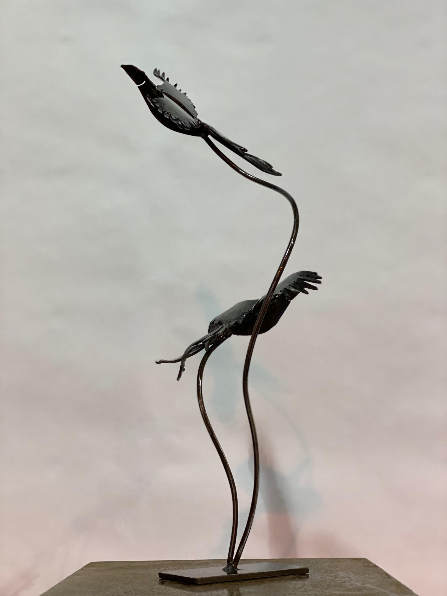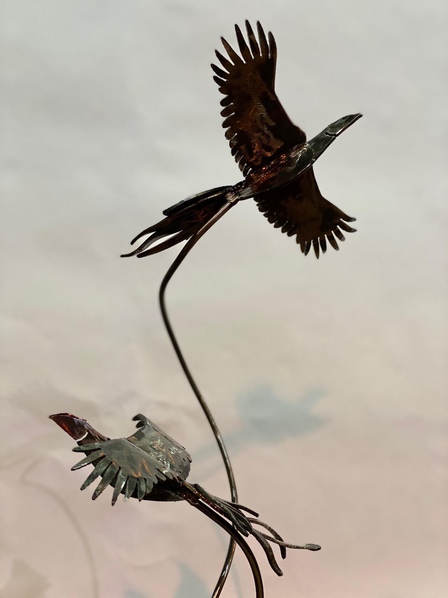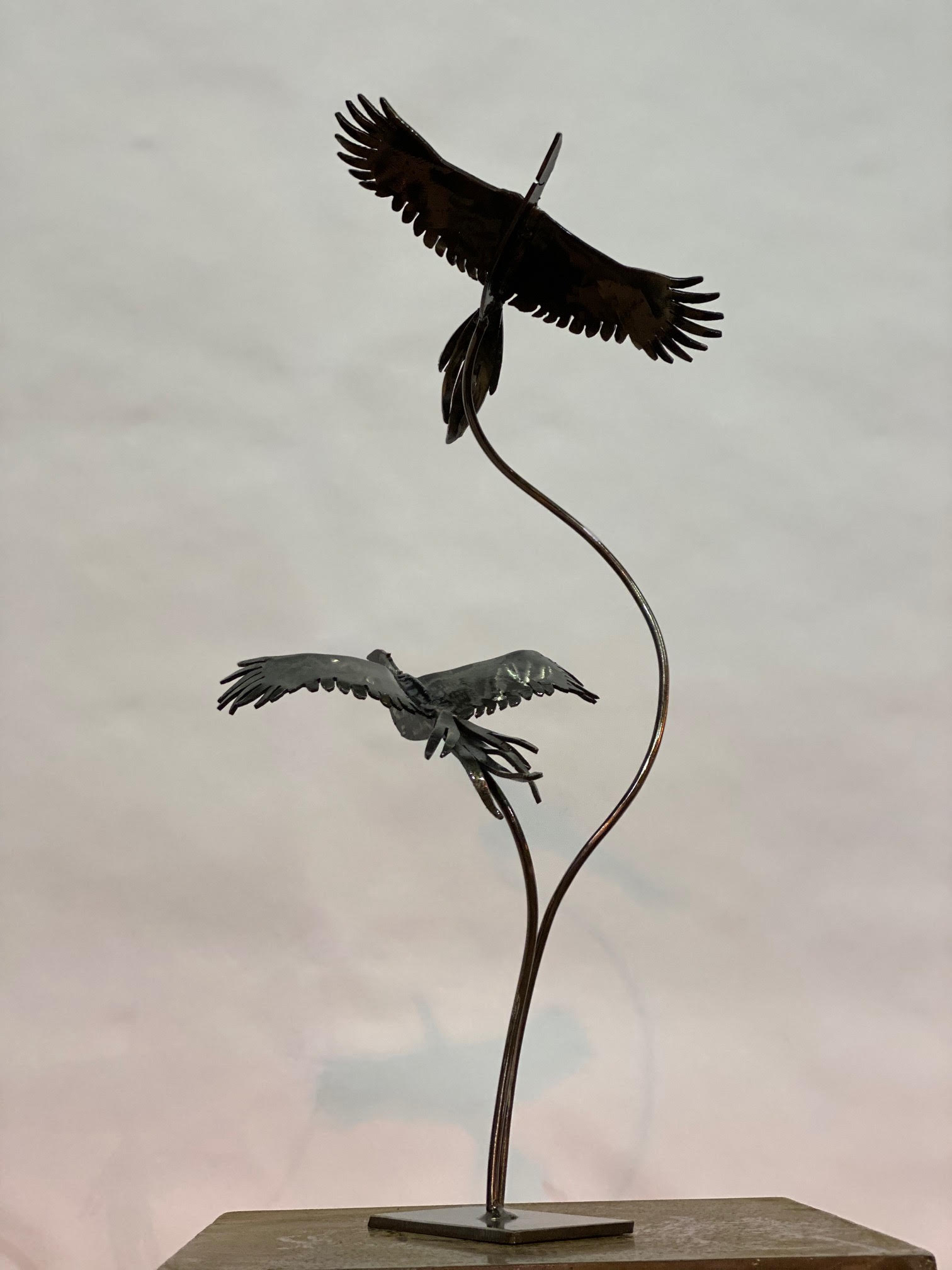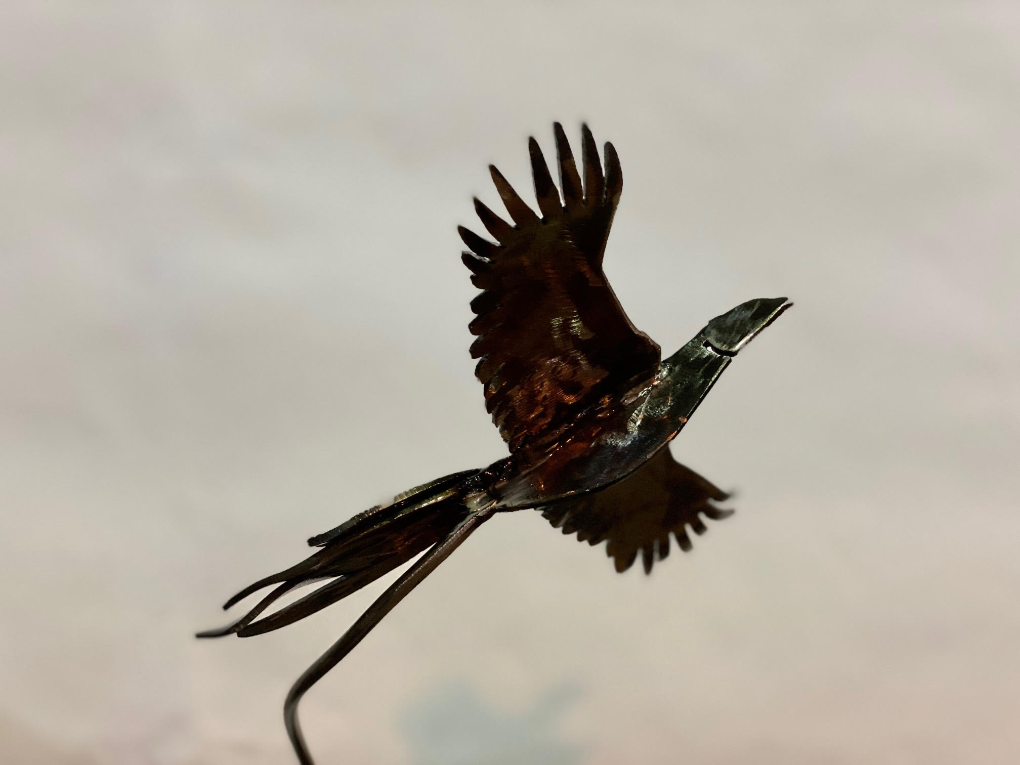 Once assembled, finer details such as curling, bending, and manipulating tail feathers or wing tips add that extra touch of life to the artwork. All smaller interior sculptures are securely affixed to bases made from thicker mild steel sheets, ensuring stability. Our preferred finish for interior pieces is a brushed steel effect, achieved by applying elbow grease and a wire brush. We then seal the pieces with a layer of either matte or gloss lacquer to preserve the natural tones of the metal.