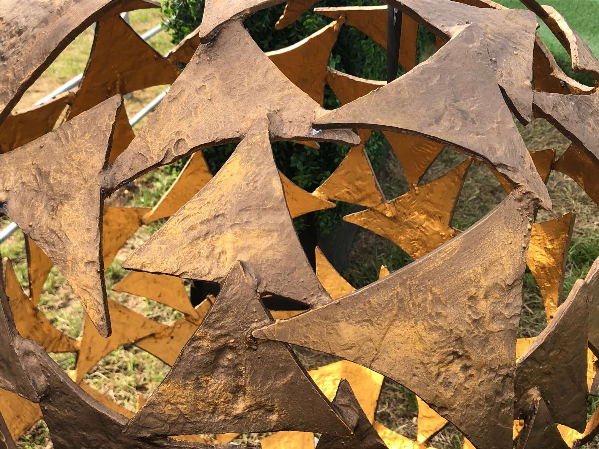 One of our most illustrious sculptures; Available in an array of sizes, patterns, styles & finishes make this popular sphere suitable for pretty much any garden or outdoor space. Designed and Handcrafted by Charles Elliott Sculpture from mild steel with a luxurious Bronze Cappuccino and gorgeous Gold gilt Interior. This piece is hot zinc galvanised initially to secure and protect it from nature and rust for over 30 years. Designer Charles said: “Each sail piece individually textured and finished with a luxurious patina by hand!”