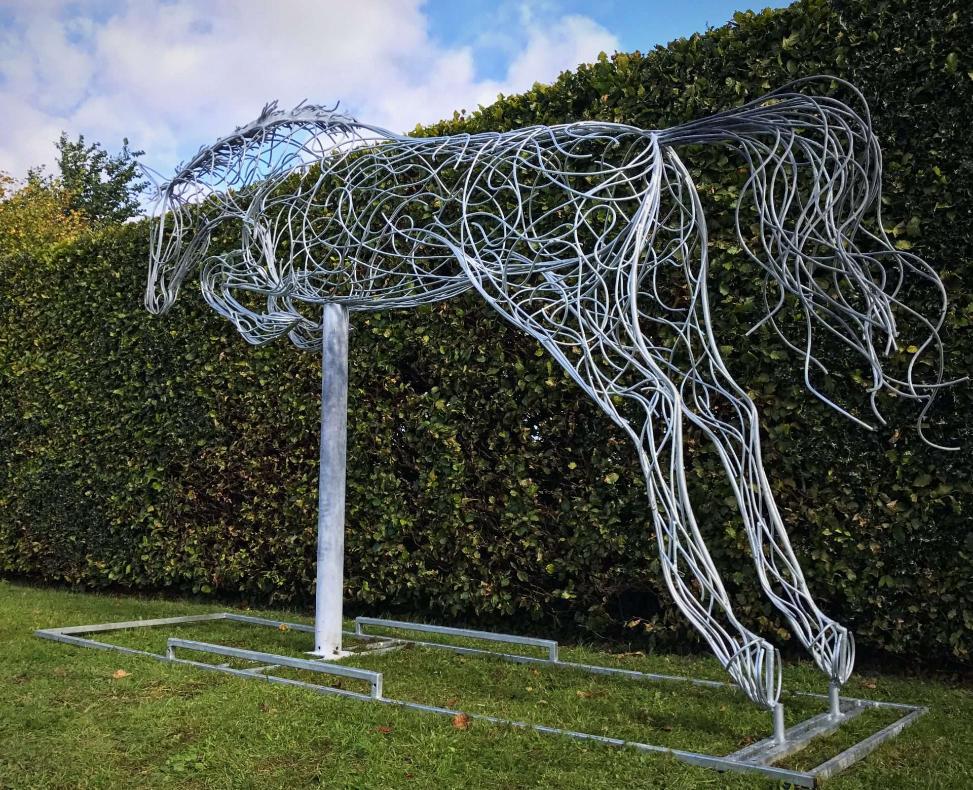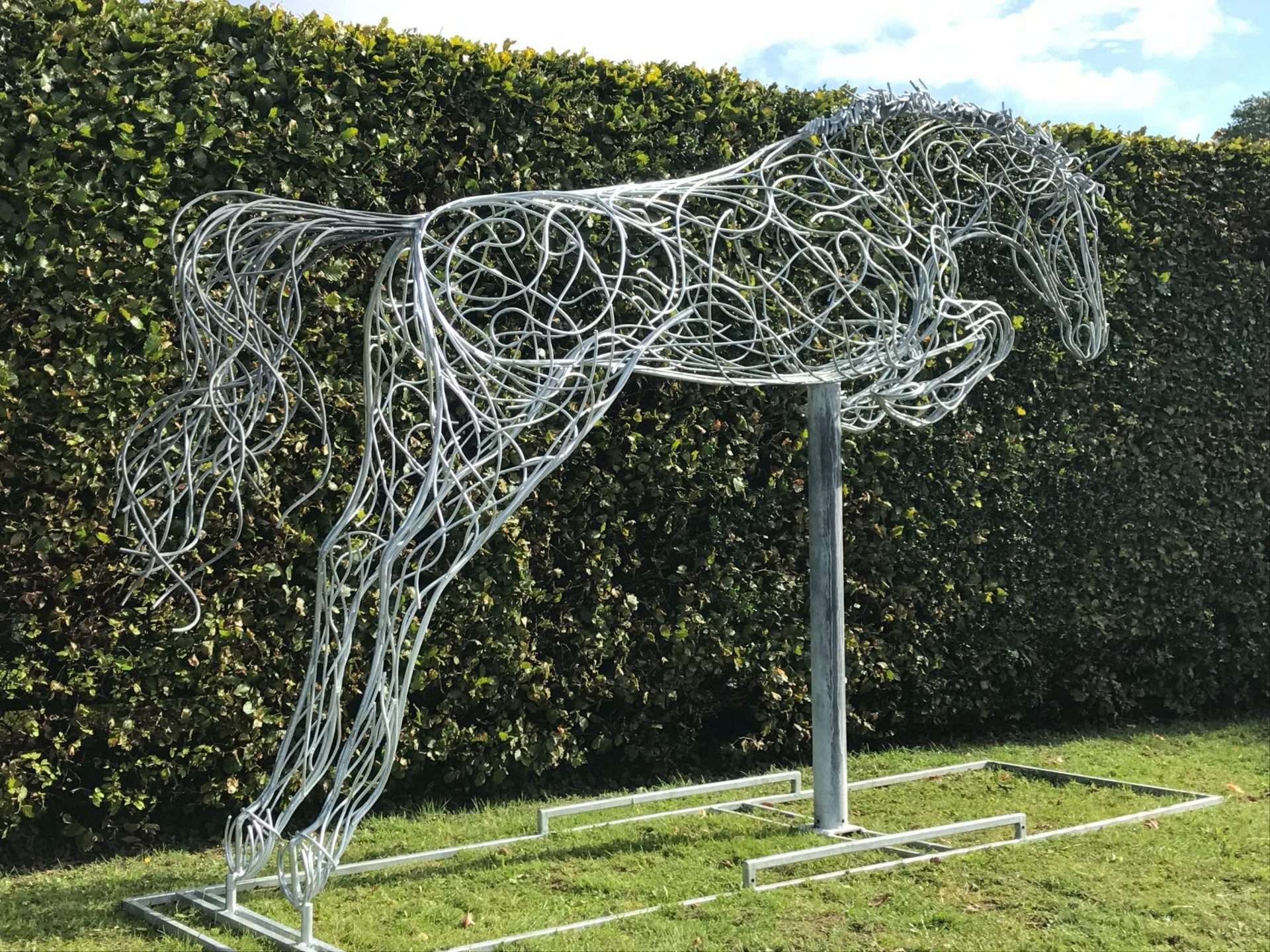 Once happy, the outline of the sculpture will then start to be hand bent using 8mm or 10mm mild steel bar, ensuring all the curves of the outline are correct prior to welding together ready to stand up. The bare line of the sculpture is then stood up, with each leg correctly in place, the body outline can then be seen in its true size. This is the crucial moment where Charles & the team will be able to see any imperfections or complications the sculpture may well throw at them along the way. Each small 6mm or 8mm mild steel bar will be hand bent & cut ready to create the muscle definitions, the depth, the movement & the character of the animal.