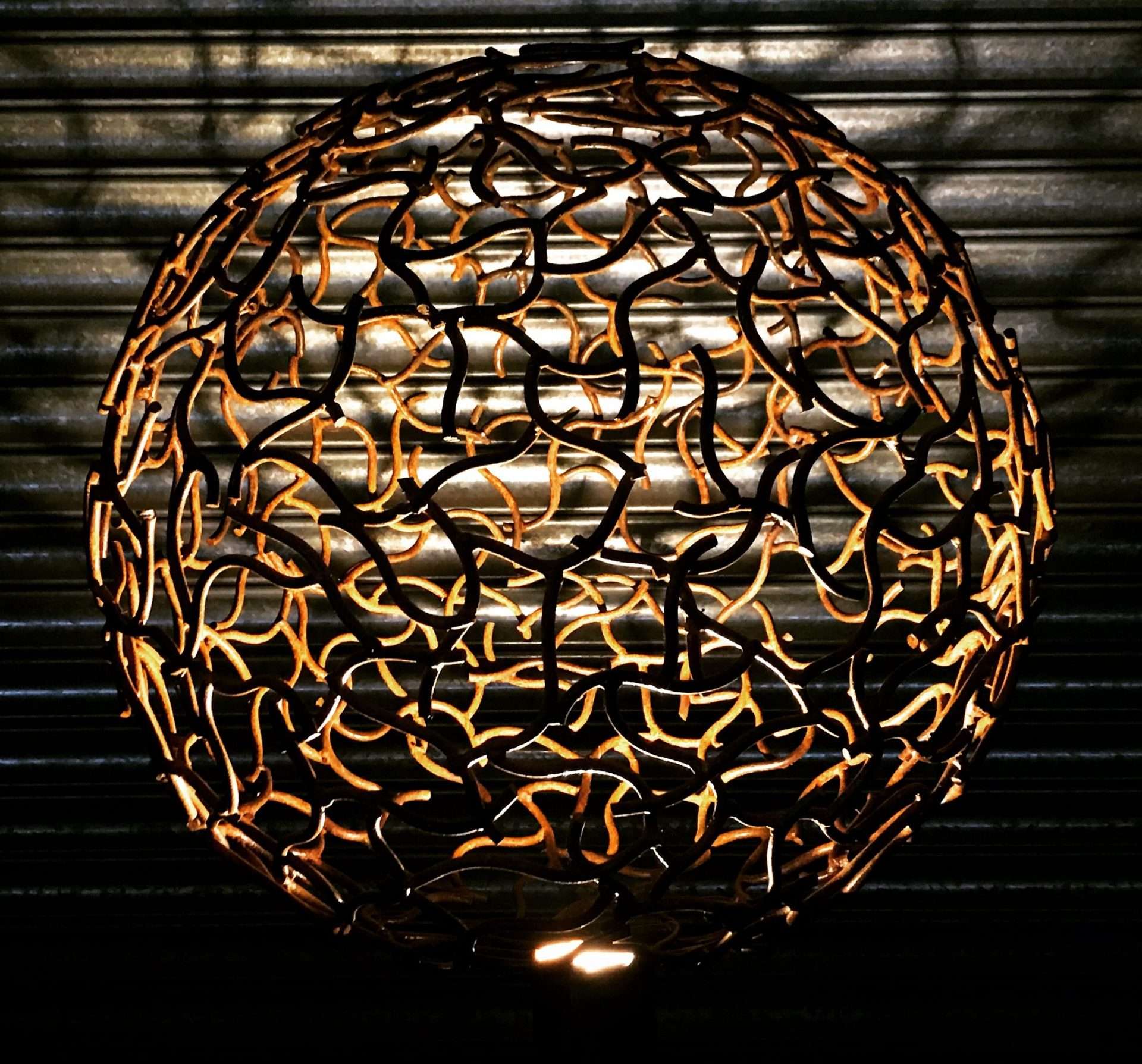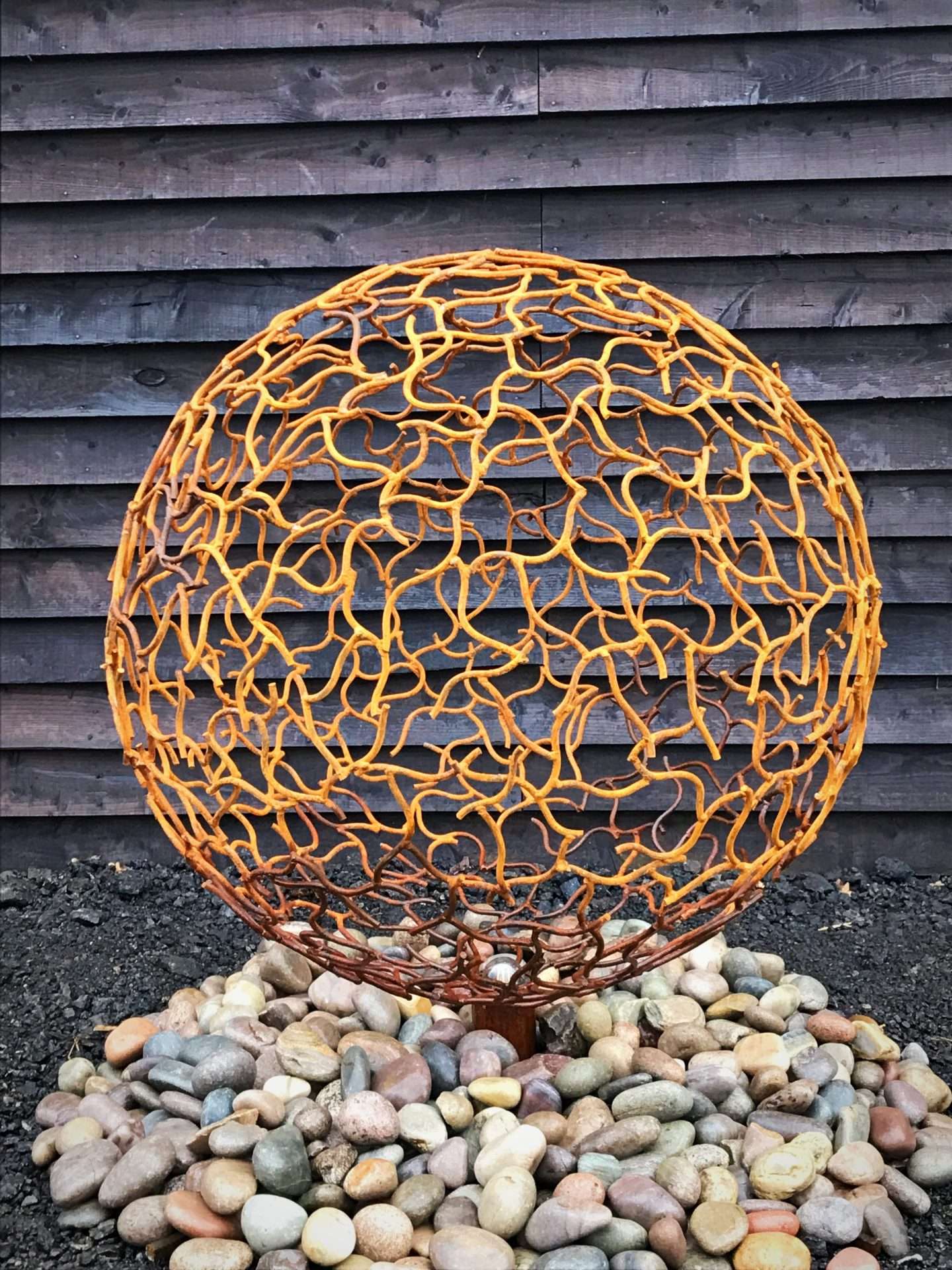 The spheres are created in 2 halves to ensure the perfect spherical shape. The two halves will be lifted off the mold frames & lowered down to be welded & infilled once safely together. Once each piece is in place & the team are happy the sphere is ready for the finishing process. Once entire, the sphere will undergo a sand blasting process to ensure an immaculate end article no matter which finish is chosen. For all of our spheres we offer the finish of the luxurious rustic patina,adding that stunning orangey toned finish or another option is our hot zinc galvanise finished, giving not only the longevity due to the process but providing a life long stunning silvery grey effect. We are even able to offer full powder coat colours from the RAL colour chart should you wish to have your own twist on the finishes. With all of the options available above & the option of an array of sizes, patterns & styles make this popular sphere suitable for pretty it makes our spheres a popular choice of pretty much any garden or outdoor space.