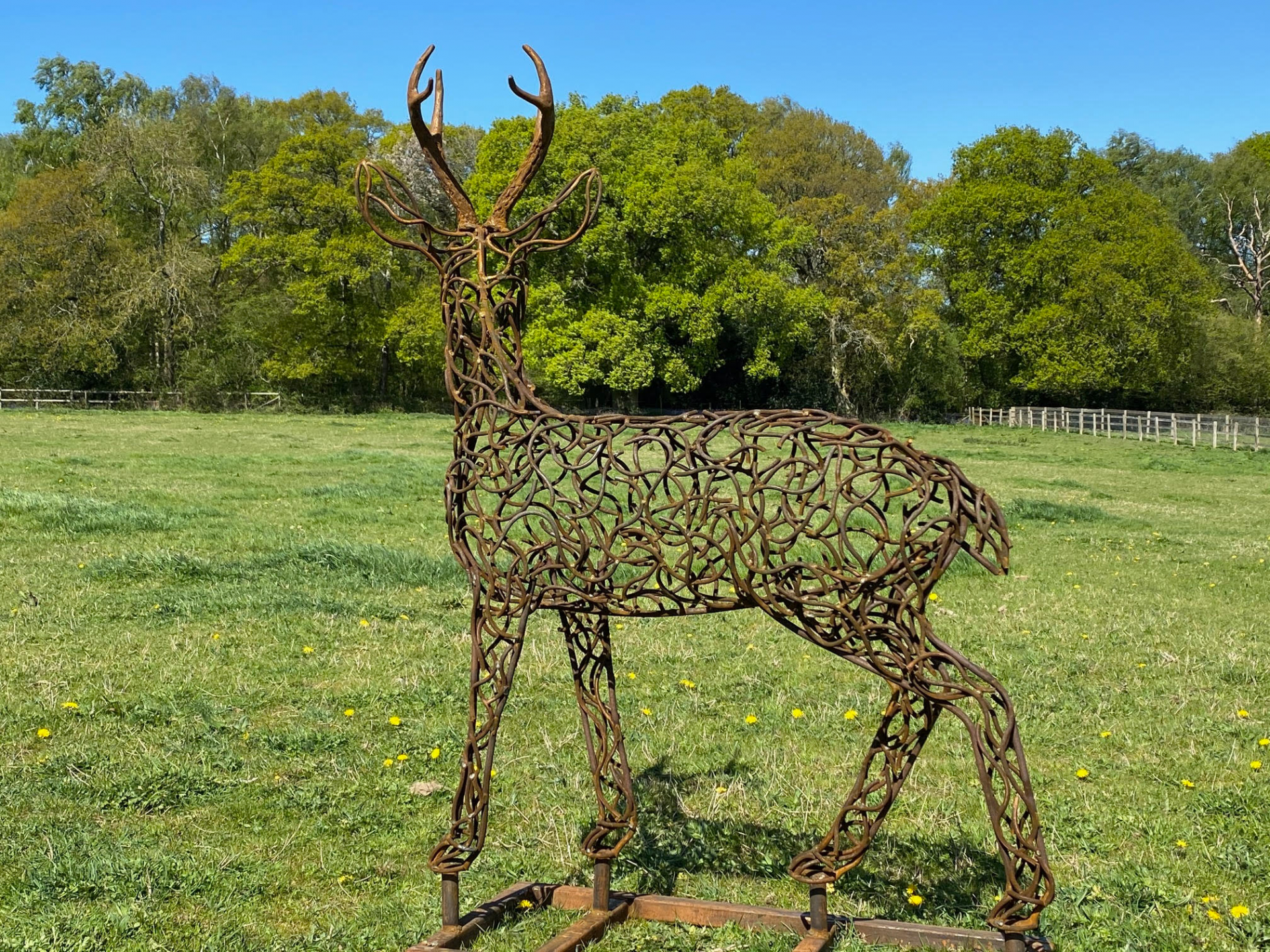 The method by which this particular sculpture is created — and indeed all our sculptures — begins with simple old-fashioned pencil to paper; this is where Charles’s ideas first come to life. A sketch is hand drawn by Charles within his studio, giving the animal movement, character, and lifelike qualities prior to establishing sizes, measurements, and dimensions. Once completed, the sketch is transferred onto a very large metal footplate within the studio using artists’ chalk. The chalk sketch can remain on the floor for up to a week while Charles edits, alters, and adapts the drawing until completely satisfied. Once happy, the outline of the sculpture begins to be hand-bent using 8mm or 10mm mild steel bar, ensuring all curves of the outline are perfect prior to welding and standing the piece upright.
