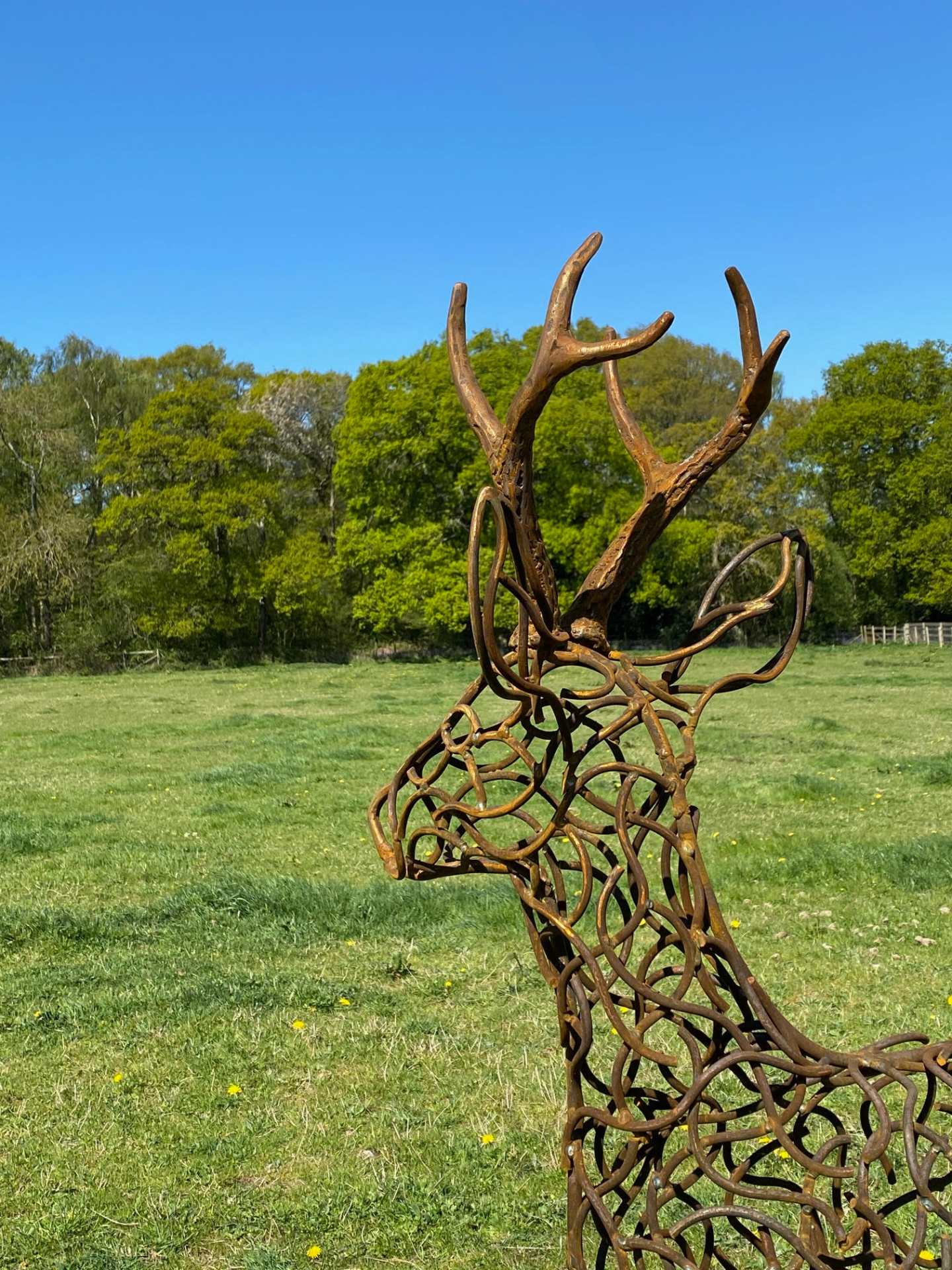 The antlers, crafted from a single large piece of thick mild steel bar, are heated to an intense temperature that allows Charles to add depth, detail, and texture using just heat, the anvil, and a blacksmith’s hammer. This craftsmanship is one of the many reasons why each sculpture is unique. The sculpture then moves on to its finishing process. Creating the Rustic Patina finish requires time to develop the desired aesthetic. We use an in-house developed solution — a blend of all-natural, non-harmful products — to encourage the warm, golden orangey-brown patina, perfectly complementing the stunning locations our customers choose for these sculptures.