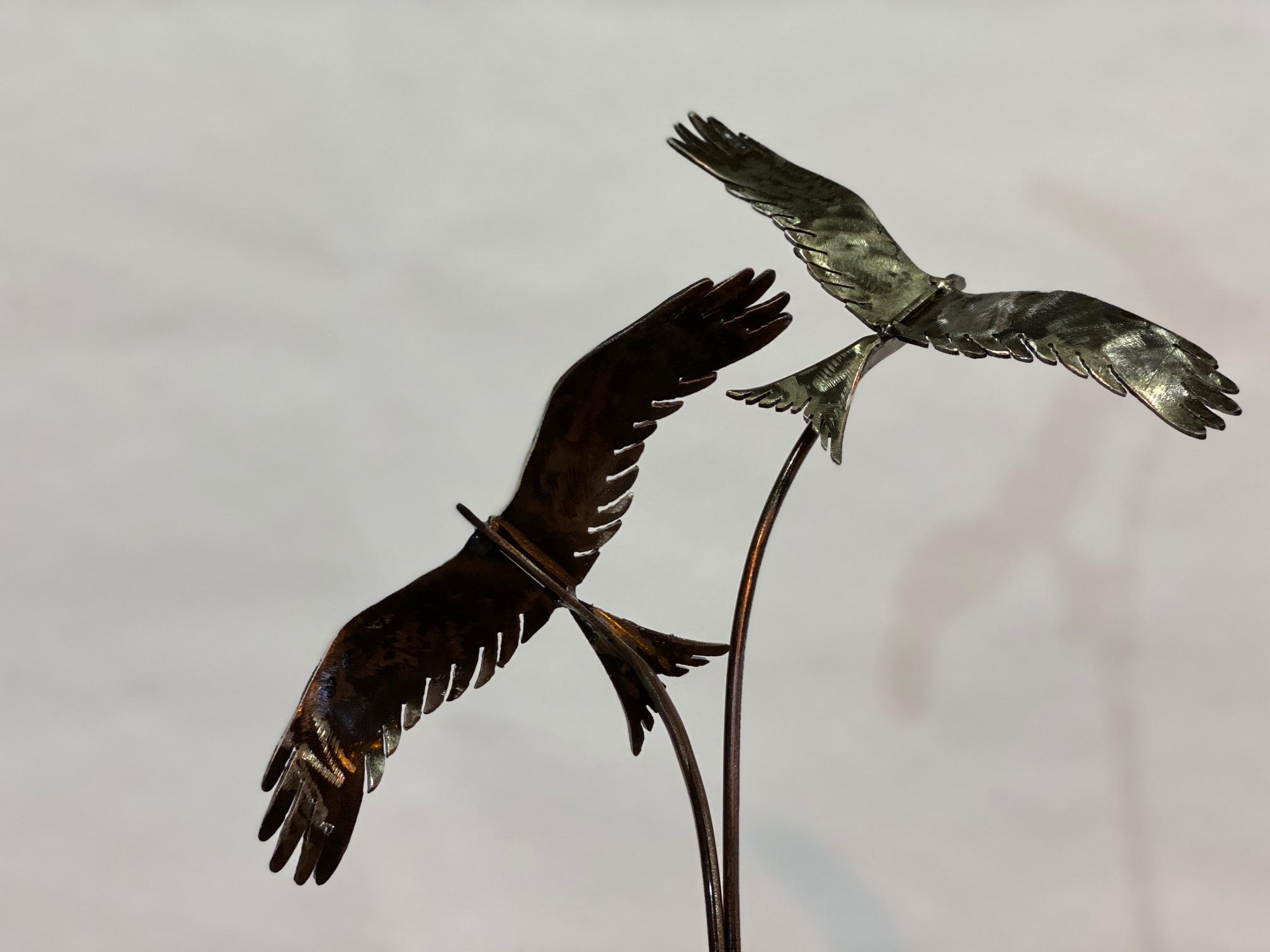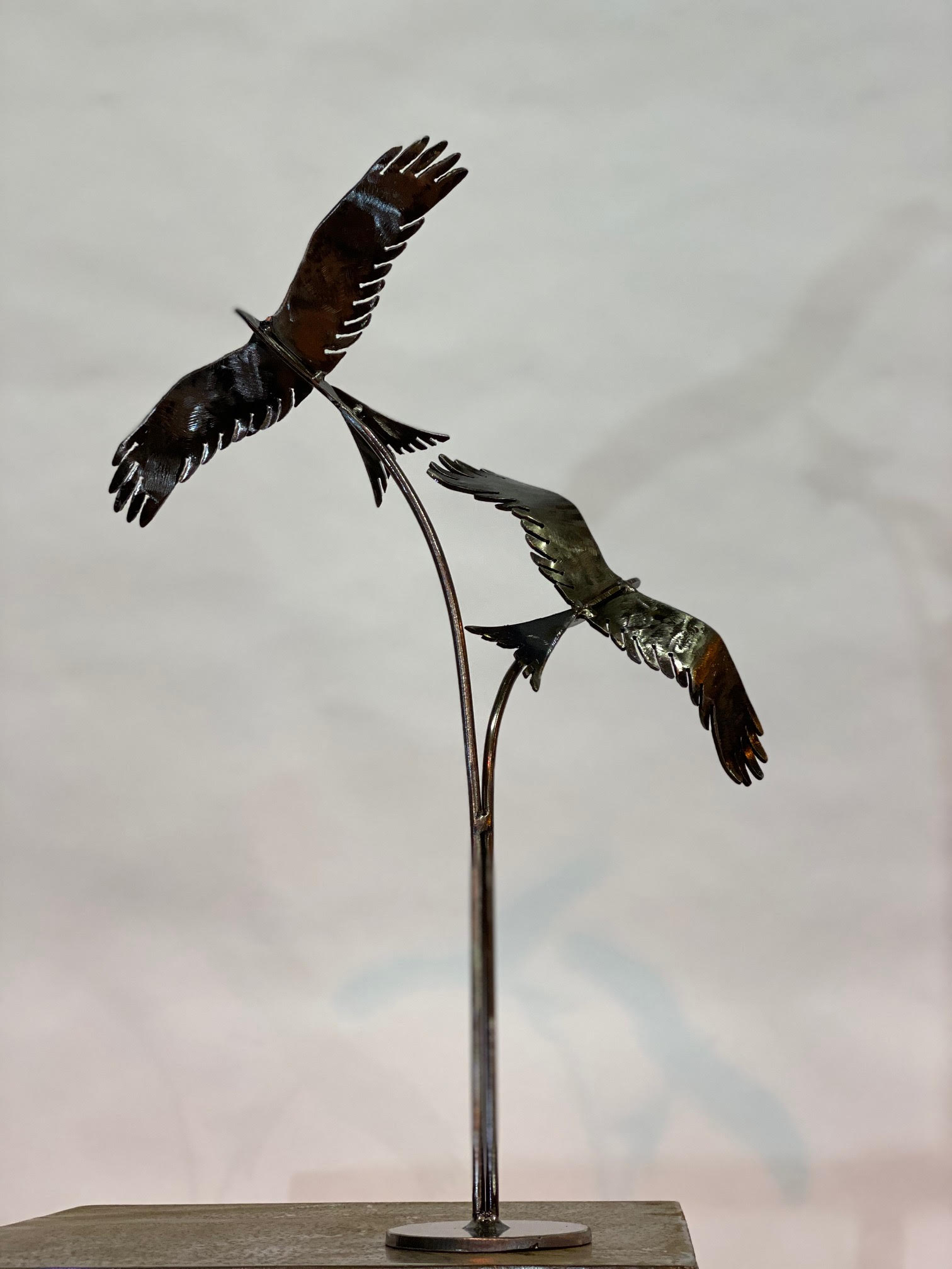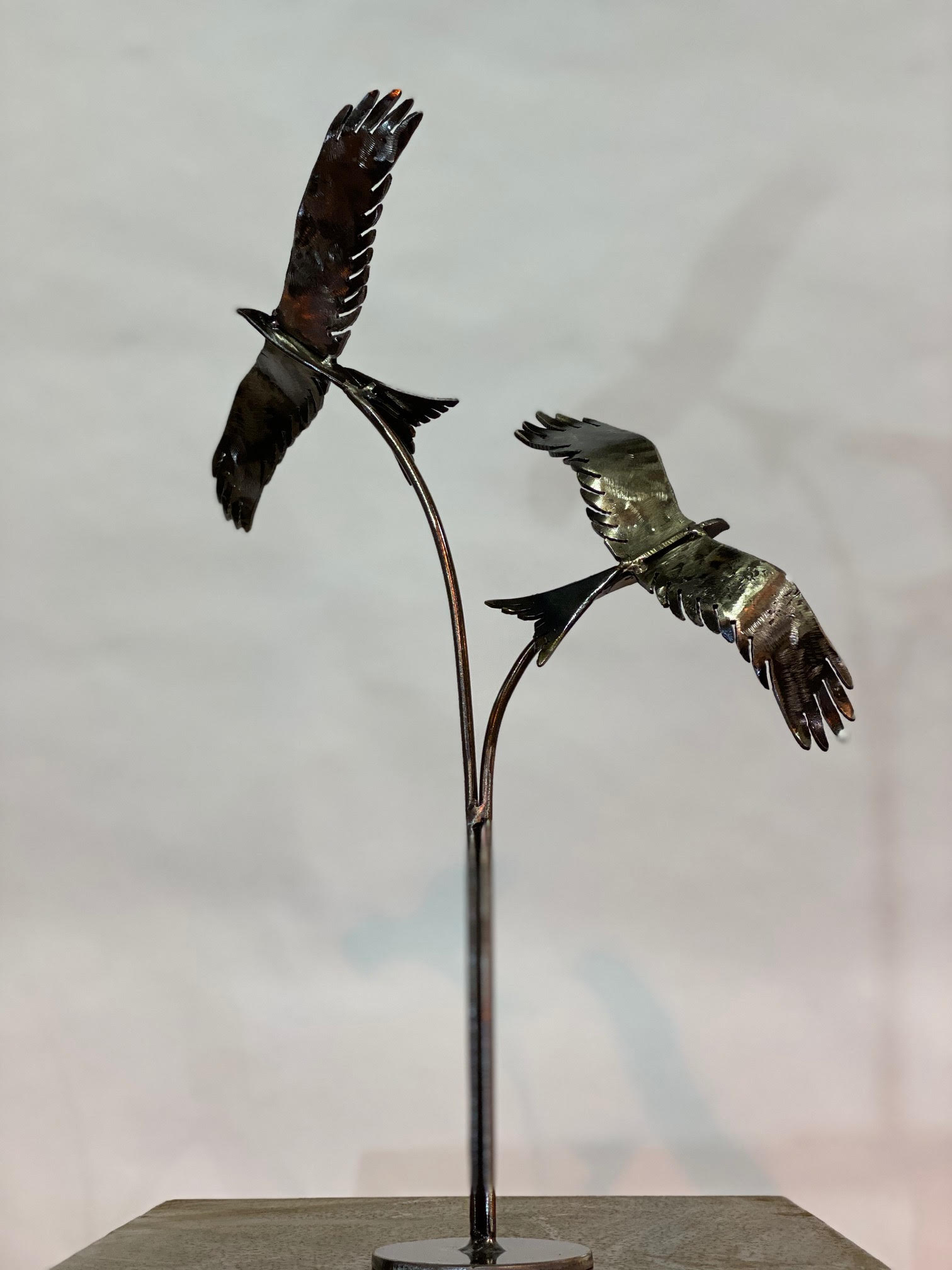 This is truly where the sculpture comes to life — one of the most magical stages in our creative process. Charles carefully and slowly welds the components together, whether it’s attaching wings to a body or tail feathers to a tail, with great care to create these unique, one-of-a-kind pieces. Once assembled, finer details such as curling, bending, and manipulating tail feathers or wing tips add that extra touch of life to the artwork. All smaller interior sculptures are securely affixed to bases made from thicker mild steel sheets, ensuring stability.