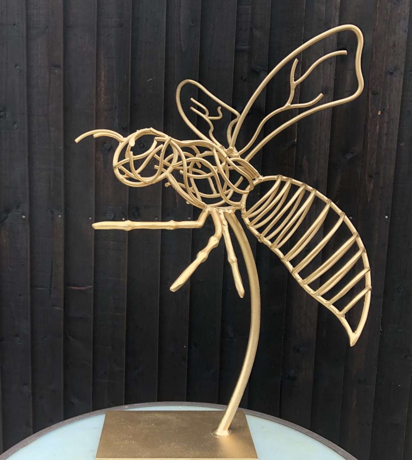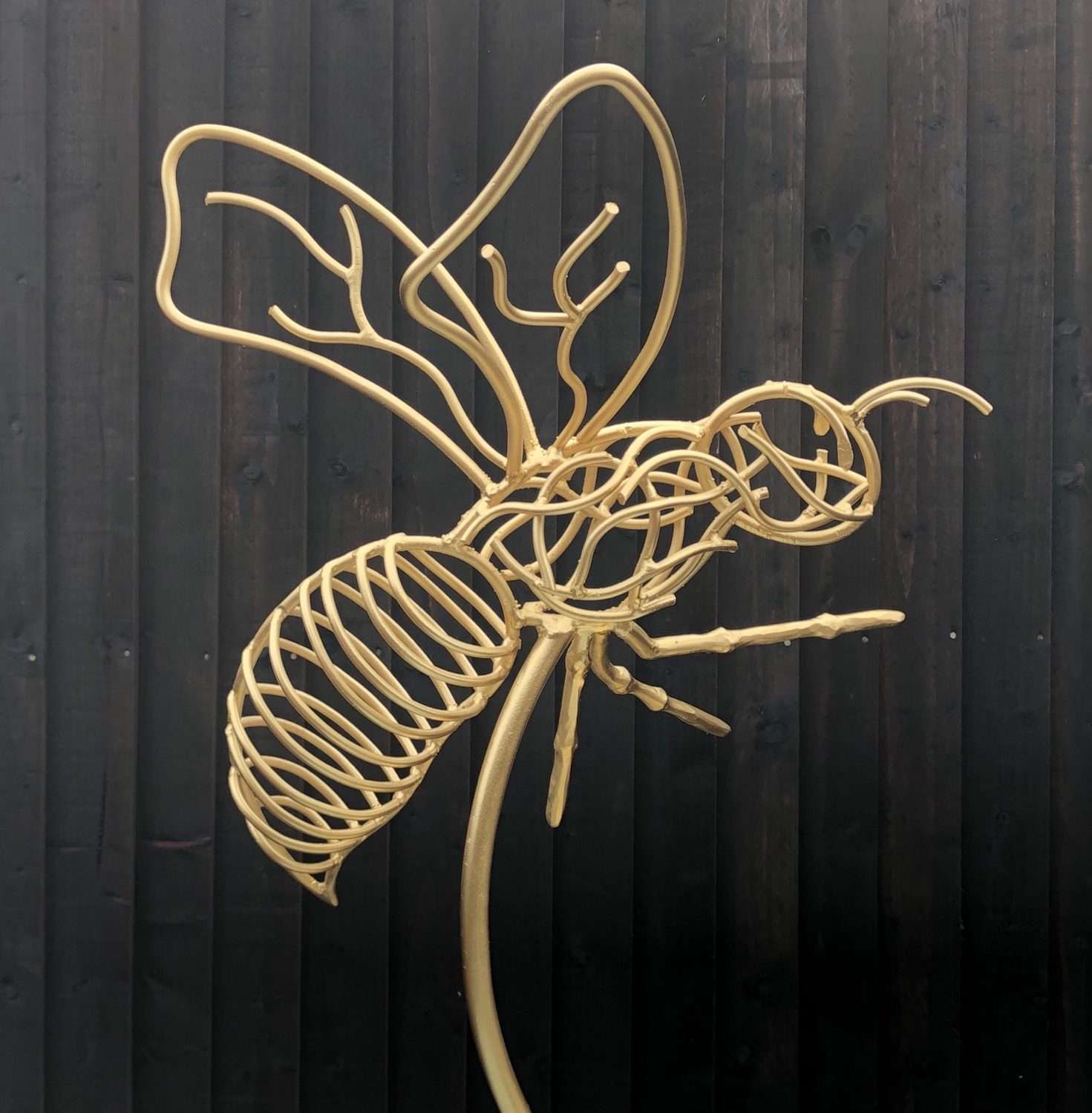 Finer touches such as the sting and eyes are crafted using some of the oldest blacksmithing techniques, including our 1920s power hammer, forge, and anvil, adding a unique handcrafted magic. The finishing touches include rustic patina, galvanised, or powder-coated finishes — including the stunning gold pictured — with the full range of RAL colours available. Once complete, the Wasp is ready to take its place in the stunning homes and gardens of our customers and clients.