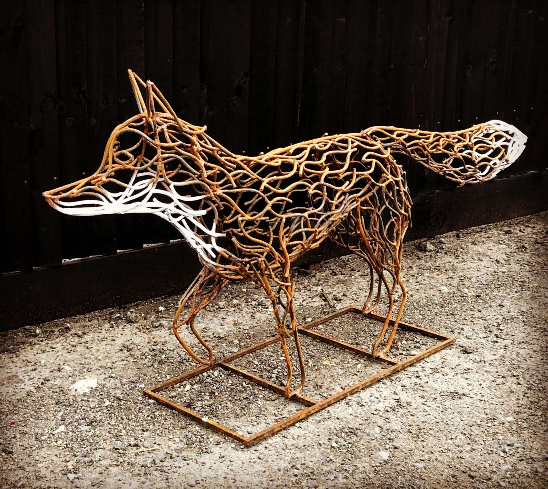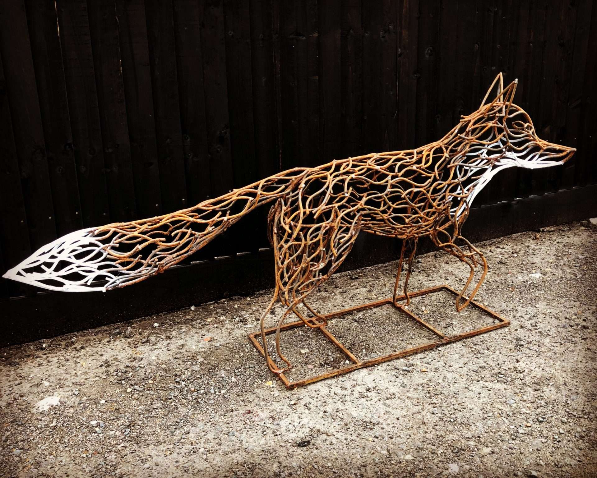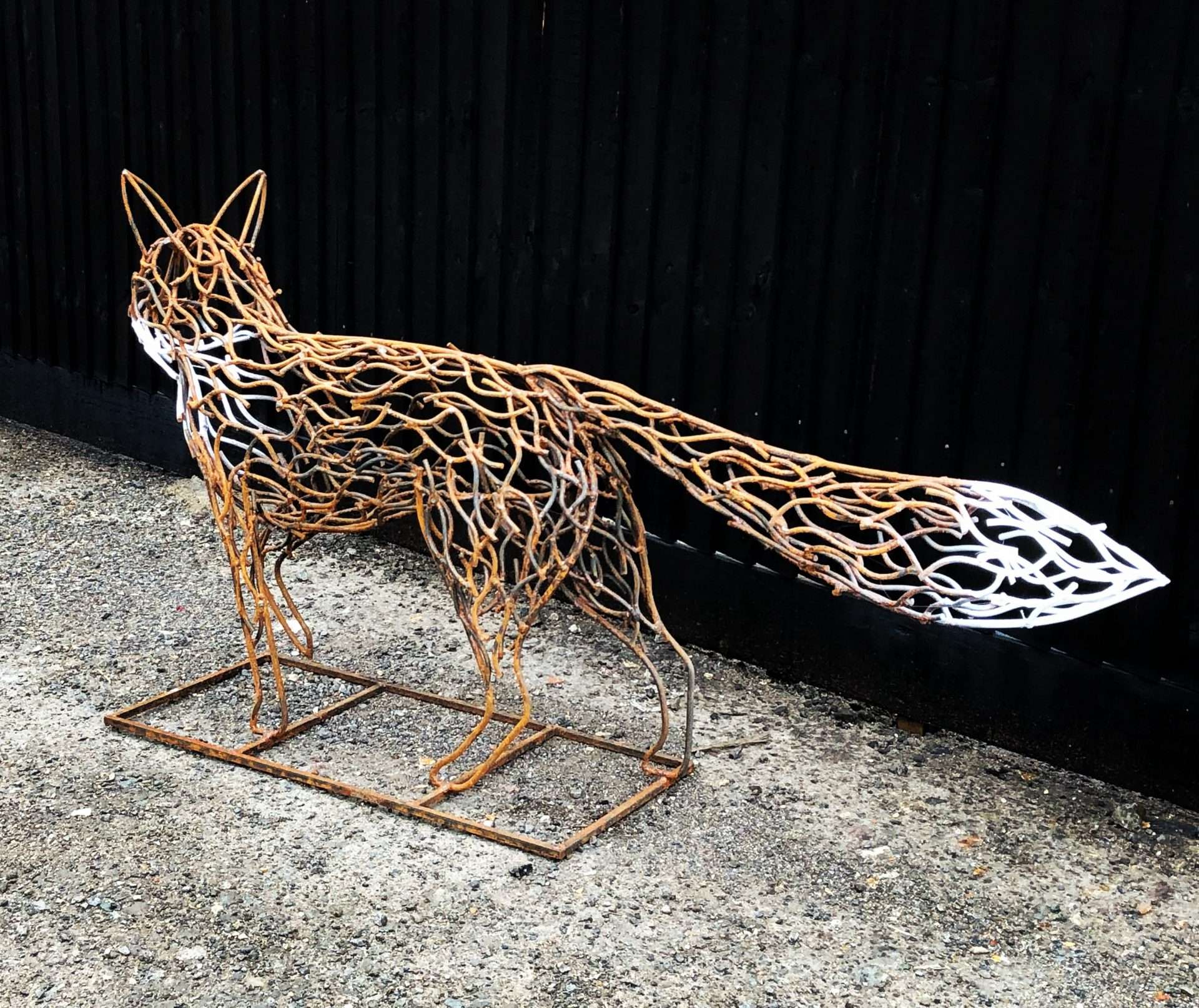 Finer details such as the bushy tail, nose, and ears are then handcrafted. At this point, traditional blacksmithing techniques come into play—using a 1920s power hammer, the forge, and an anvil to enhance the sculpture’s form and texture. Once assembled, the piece moves on to its finishing stages. The rustic patina is developed using our in-house, all-natural, non-toxic solution—a carefully blended mix designed to produce a warm, golden-orange hue that matures beautifully outdoors. Finally, the fox’s distinctive white-tipped tail and white chest are added—bringing “Mr. Fox” to life with a charming, characterful flair. This final touch completes a sculpture that is not only built to endure but designed to captivate.